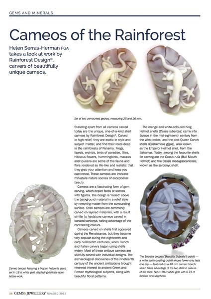 Very excited to announce the publication in Gems & Jewellery Magazine, Nov/Dec 2015 issue, the article entitled "Cameos of the Rainforest" by Helen Serras-Herman. A GemA publication, London, England. Probably the best article telling the story of how this wonderful project got started. Thank you, Helen Serras-Herman, you have supported us from the start