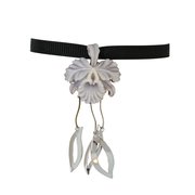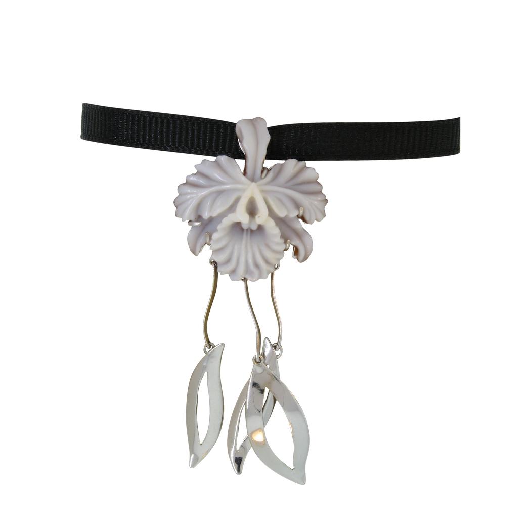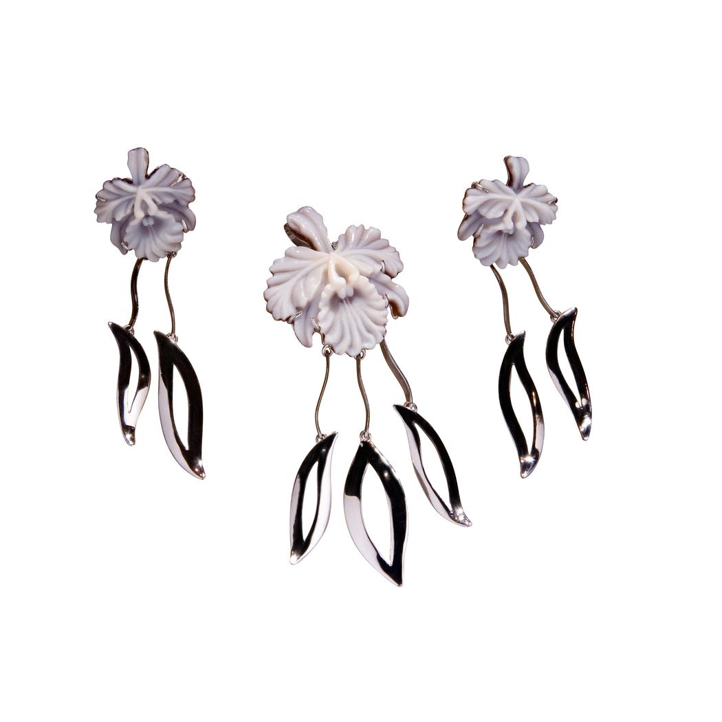 Cattleya dowiana orchid earrings & pendant, 20mm/20mm/26mm latticework cameos, set in 18kt white gold.