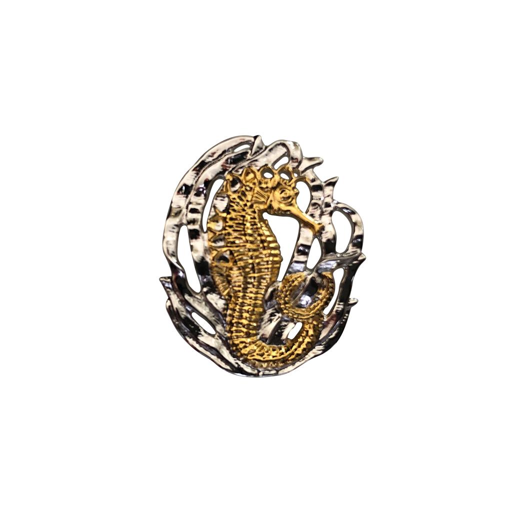 "Seahorse w/grass", is a 30mm, rhodium plated sterling silver pendant with 18kt gold plating highlighting this adorable seahorse. This authorized reproduction has exquisite detail and is an exact copy of the original shell cameo.