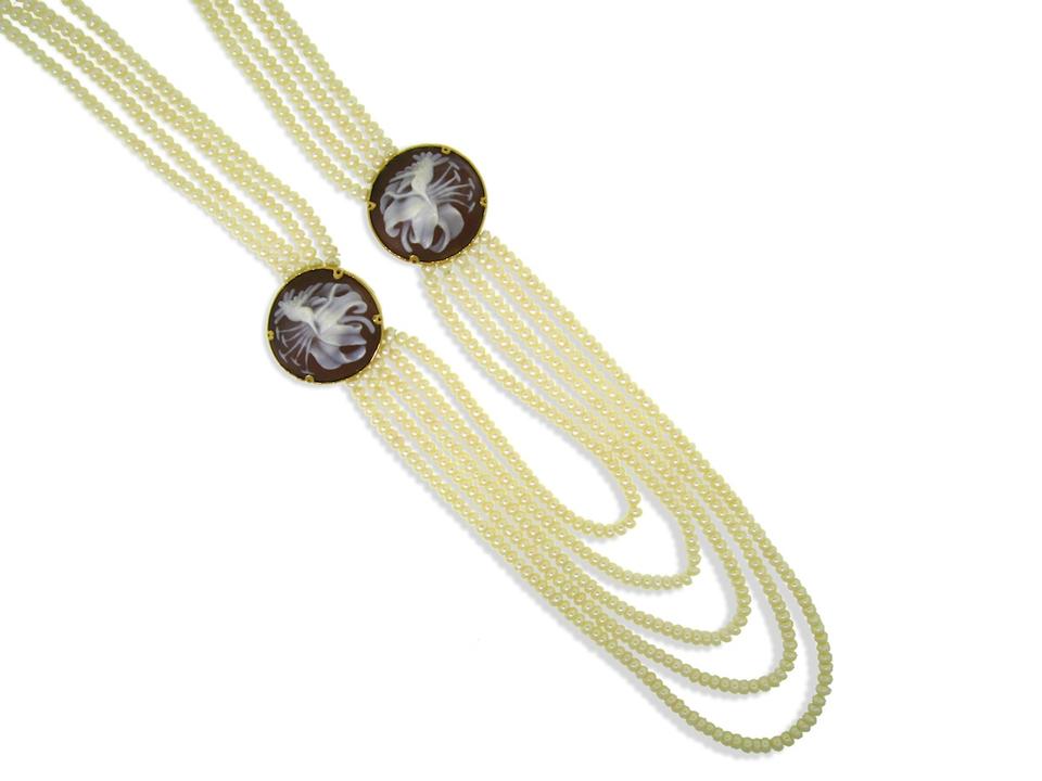 Two matching "hummingbird w/ lillium" shell cameos are set in 18kt yellow gold and paired with lovely strands of Chinese Fresh Water (CFW) white center drilled button pearls to form this one-of-a-kind Rainforest Design® cameo necklace. Cameos measure 25mm each, registry numbers 2081/2082. Sold with a Certificate of Authenticity.