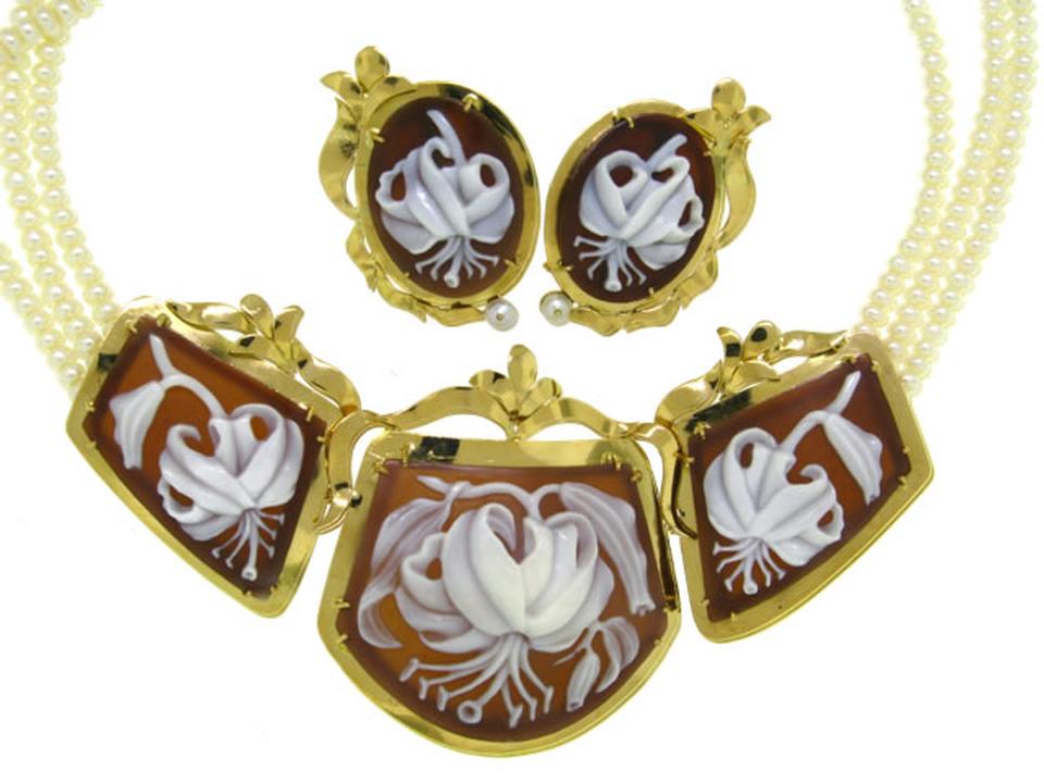 Lillium flower cameo suite or parure, set in 18kt yellow gold, with Japanese Akoya pearls accenting the cameo earrings and natural CFW (Chinese Fresh Water) button pearls forming the necklace. The three cameos in the necklace are trapezoidal in shape and measure 35mm, 37mm, and 40mm (center). The cameos in the earrings are elongated ovals and measure 23mm each. Registry numbers 1591,1592,1593 (necklace), 1662 and 1663 (earrings). Eco-friendly, Fair Trade. Sold with a Certificate of Authenticity.