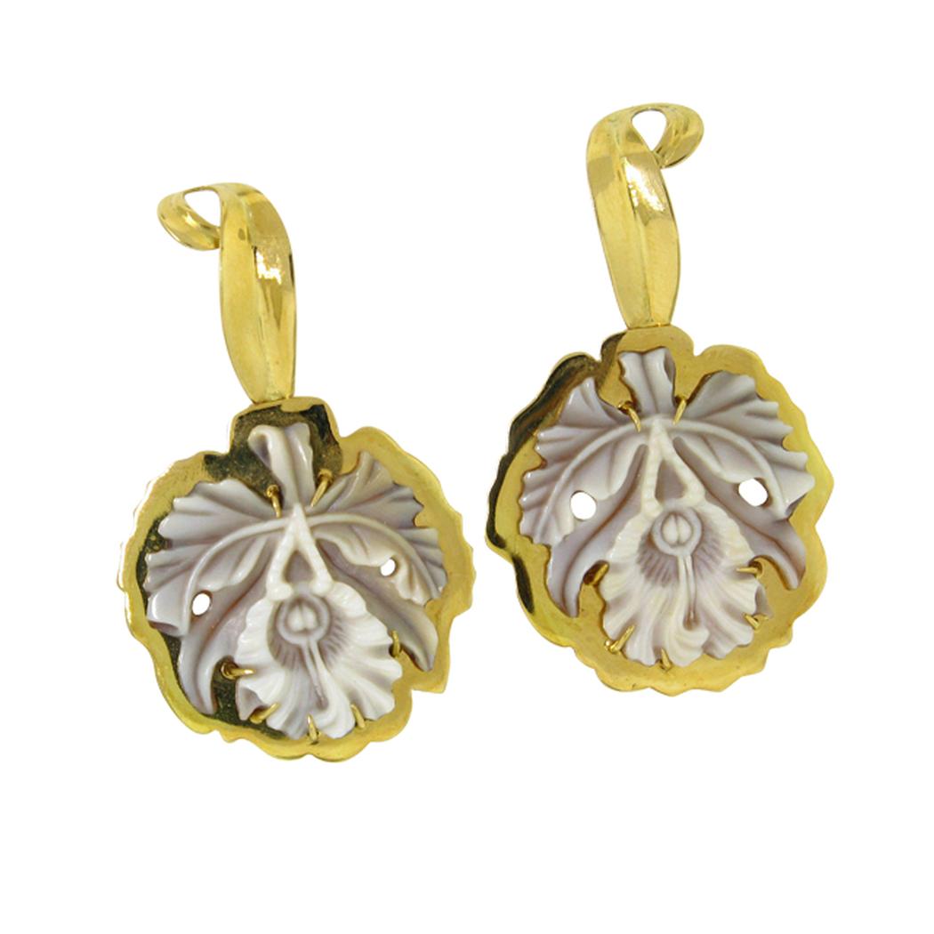 Cattleya dowiana orchid earrings, hand carved, "latticework" technique, sardonyx shell cameos, 23mm/23mm. Set in 18kt yellow gold. These are absolutely lovely for a bride on her very special wedding day and then can be used every day thereafter as they are very light and go with everything!