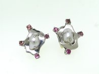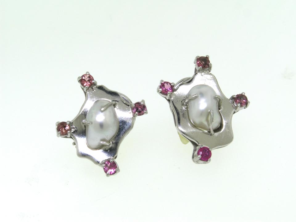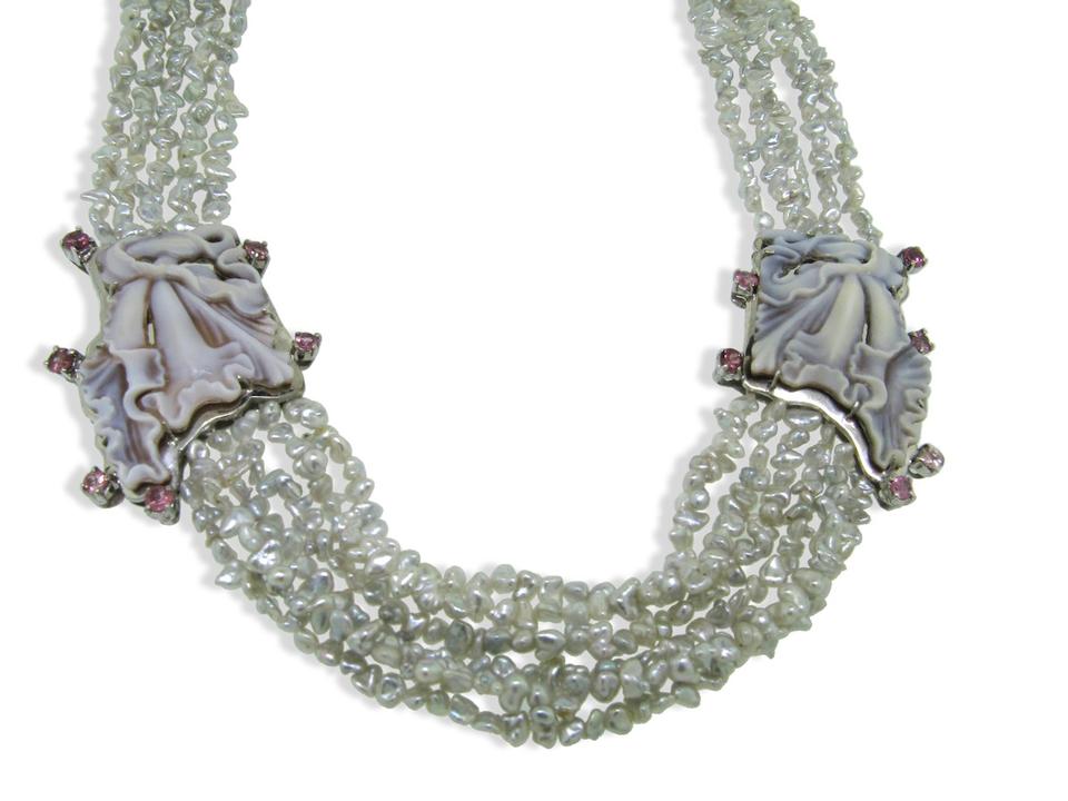 Cattleya orchid cameo necklace w/pink tourmalines & keshi pearls. The orchids are in profile or side view, 38mm each, surrounded by multiple strands of lovely grey keshi pearls. Registry numbers 2617/2619. Set in 950 silver. Sold with matching pearl and pink tourmaline earrings (see additional photo). From the Bridal Collection. Comes with Certificate of Authenticity. Eco-Friendly, Fair Trade.