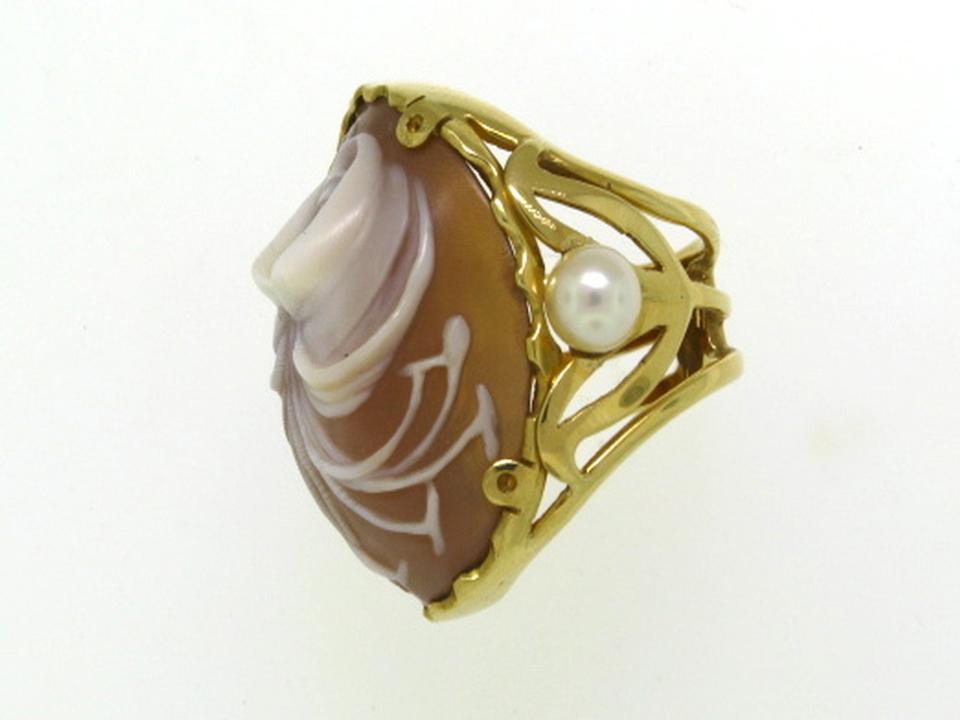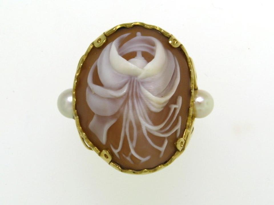 Lillium martagnon flower cameo ring. This is a 28mm, long oval, hand carved shell cameo ring, set with Akoya pearls in 18kt yellow gold. Size 7/7.5. Registry #1188. Sold with a Certificate of Authenticity. Eco-Friendly, Fair Trade. Available at the Topaz Gallery, Buckhead, Atlanta, Georgia.