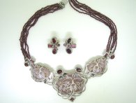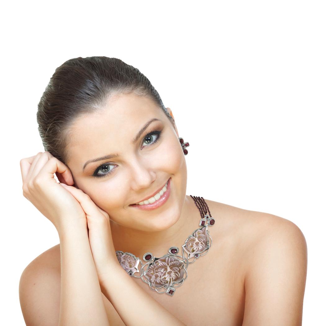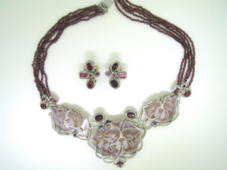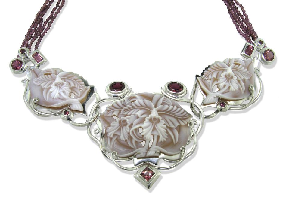 The charming young woman wears our stunning Cattelyea Laeliinae Orchid hand-carved cameo neckpiece with coordinating earrings, purchased separately. The neckpiece is set in luxurious 950 silver and feature richly hued rubellite tourmaline and raspberry pink garnet gemstones, all bezel set. The exquisite cameos measure 45, 40, and 41mm in size and are rendered in the exclusive latticework style. Registry # 2645, 2646, 2647; Accompanied by Certificate of Authenticity. Illustrated in Rock & Gem magazine, August 2014, The Art of Cameos".