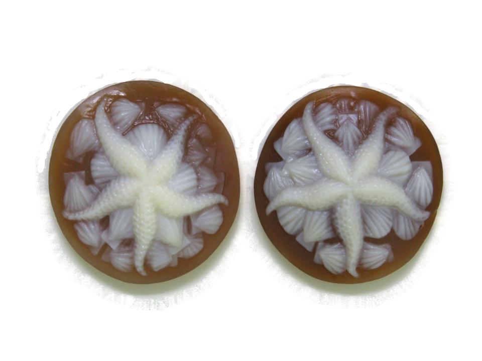Starfish w/shells 2pc cameo set, 24mm each, round shape. Registry numbers 1579, 1580. Sold with a Certificate of Authenticity. Eco-Friendly, Fair Trade.
