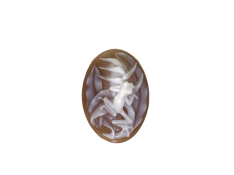 Stick frog with halyconia, 35mm oval, handcrafted shell cameo. Registry #2707. Sold with a Certificate of Authenticity. Eco-friendly, Fair Trade.