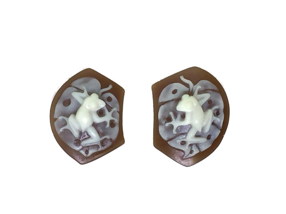 The Queen's helmet shell is considered the best for cameo carving, and that is the only sheel we use for Rainforest Design® cameos. This pair of cameo frogs resting on a leaf gives us a clear example of why this shell is considered the best. The color contrast between white against the dark brown background is excellent.